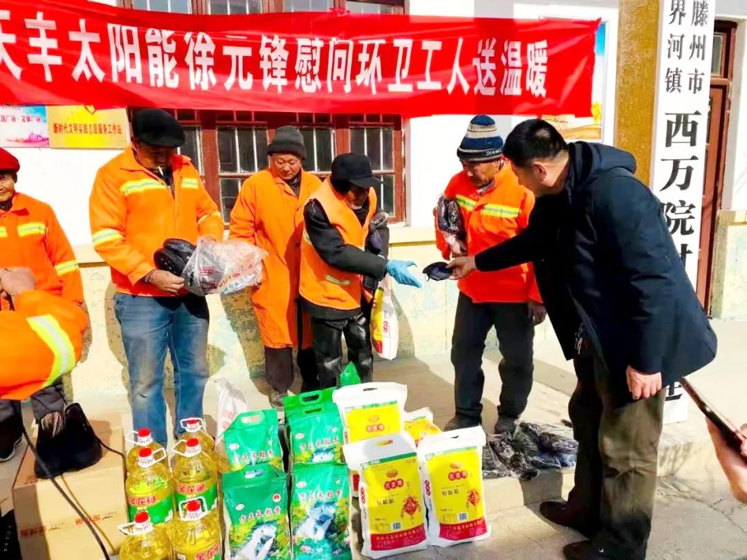近日寒潮來襲、氣溫驟降,環(huán)衛(wèi)工人作為城市的美容師,每天起早貪黑,用自己辛勤的汗水維護著干凈整潔的市容環(huán)境,為了表達對環(huán)衛(wèi)工人辛苦付出的感謝,切實關心關愛環(huán)衛(wèi)工人冷暖,2021年1月14日,天豐優(yōu)秀代理商徐元鋒趕赴滕州,在嚴寒之際為環(huán)衛(wèi)工人送去了特別的“溫暖”。