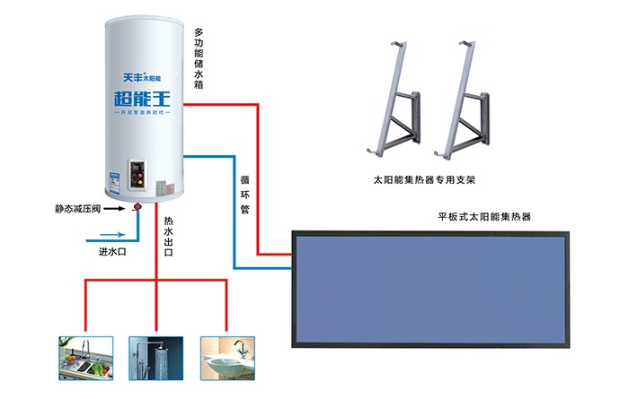 本系統采用天豐陽臺壁掛分體式太陽能熱水機,吸熱部件(太陽能集熱器)與儲熱部件(水箱)分離式安裝,集熱器安裝于南面陽臺上,儲熱部件(水箱)安裝于室內陽臺上,然后通過管路把太陽能集熱器、水箱和室內衛生間、廚房等用熱設備相連接的一種分戶集熱、分戶儲熱式太陽能熱水系統,整個系統為承壓式運行,間接加熱。