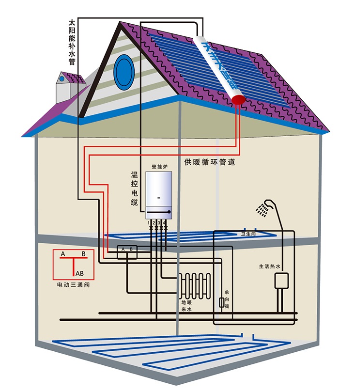 本系統(tǒng)是將太陽(yáng)能轉(zhuǎn)換成熱能,供給建筑物冬季采暖和全年其他用熱的系統(tǒng),其供暖末端采用的是地板輻射采暖系統(tǒng),適應(yīng)各種房型采暖及生活熱水供應(yīng)。