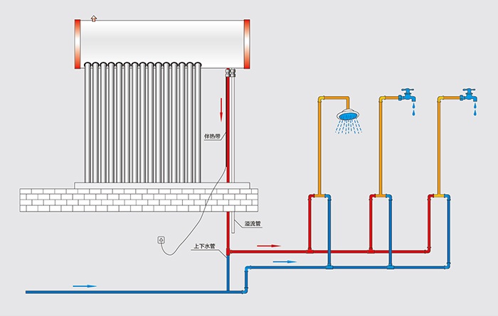 供水方式采用落水法,太陽熱水機的安裝高度高于用水點;